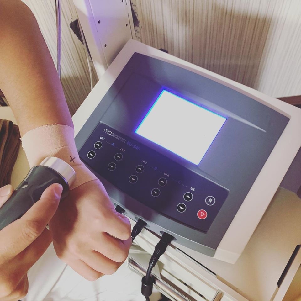 1日おいて内側手根側副靭帯の部分に超音波とハイボルトを当てて炎症を抑えミトコンドリアを活性化さし回復力をあげます。